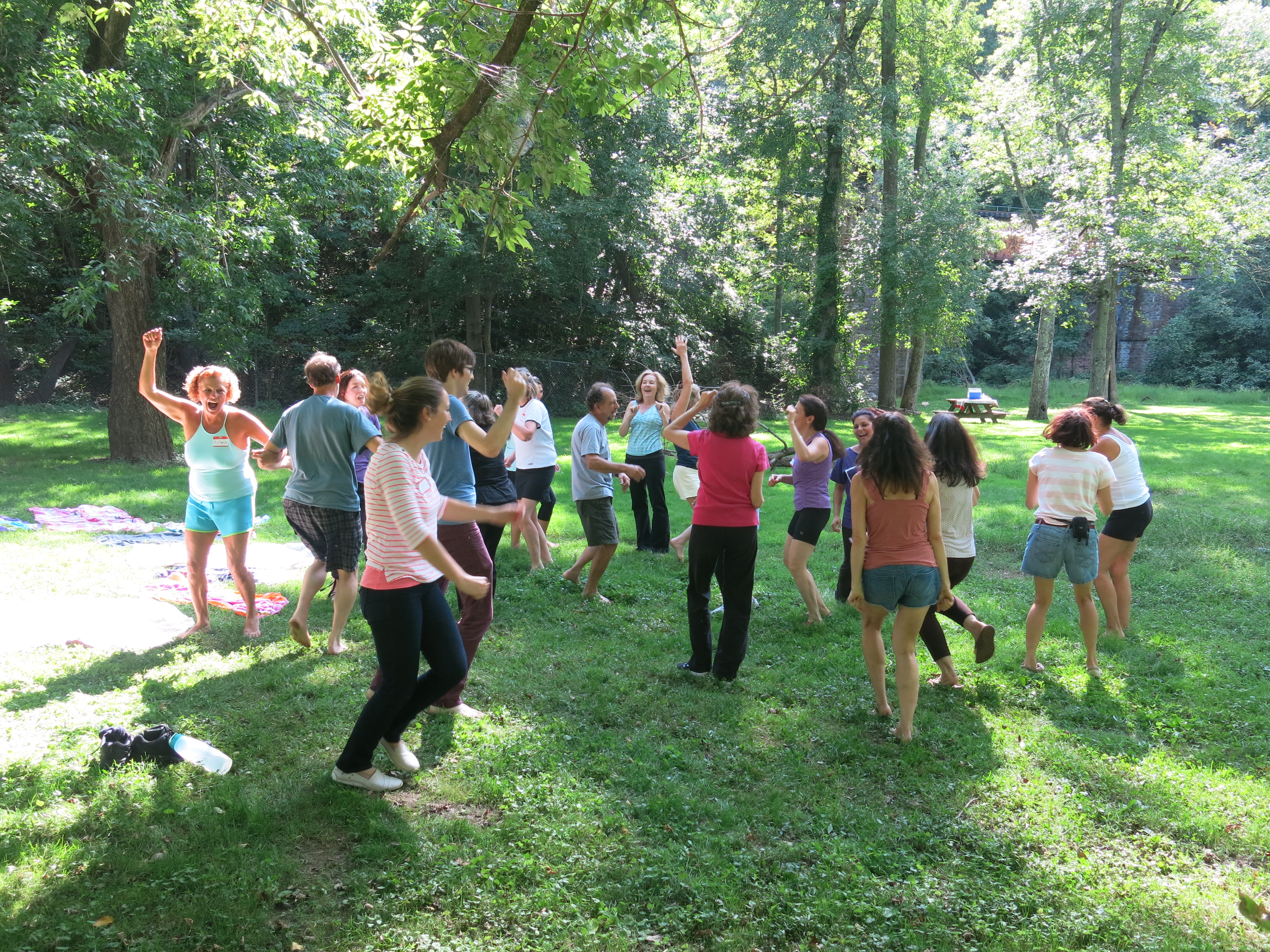 1) Laughter exercises (based on everyday situations, not on jokes or comedy). Your teacher will guide you through a series of laughter exercises where you will use your diaphragm for deep belly laughter. This incorporates more oxygen to your body and brain, creating positive endorphins.